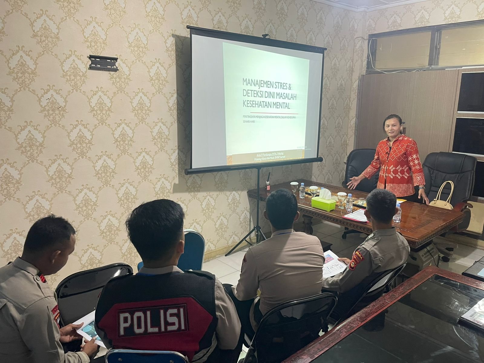 Arini Pinondang Pandiangan memberikan pembekalan kepada personel terkait bahaya penyalahgunaan narkoba dari aspek psikologis dan sosial, serta dampaknya terhadap karier dan kehidupan pribadi anggota.