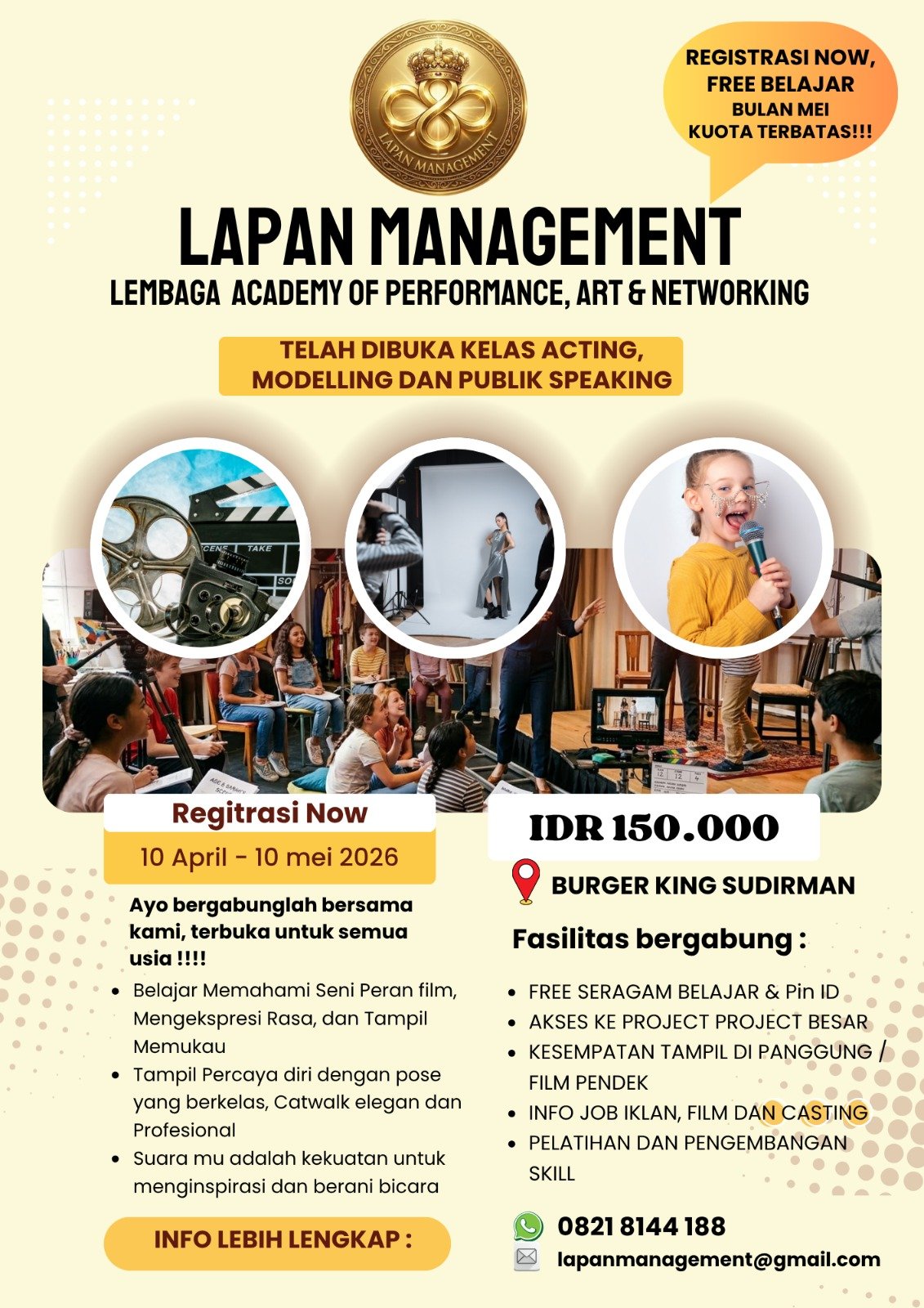 “Peserta juga diinfokan Job iklan, film dan casting serta pelatihan dan pengembangan skill ayo buruan segera bergabung dengan Lapan Management kesempatan terbuka lebar,”ajak Desi.